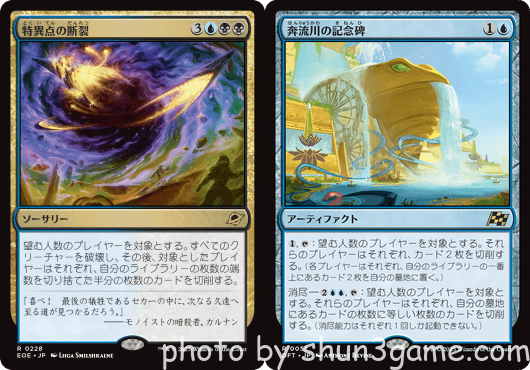 「特異点の断裂」で盤面をリセットされつつライブラリーを半分落とされ、「奔流川の記念碑」の消尽でLOされました。